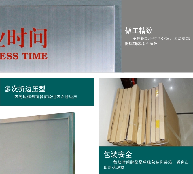 特點:四周邊框側(cè)面背面經(jīng)過四次折邊壓型,精致牢固性好,便于安裝表面文字圖案不易脫落,防腐蝕酸堿,不退色。