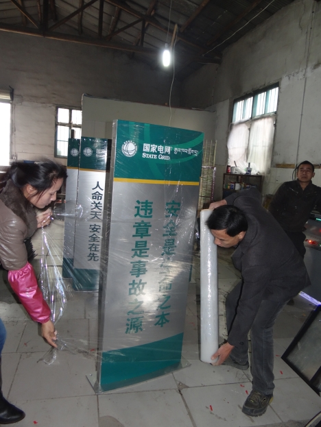 國家電網(wǎng)標(biāo)語牌為鋁形材表面打磨處理后噴底漆和面漆,絲印內(nèi)容后再在表面上再噴一層透明清漆,作工精細(xì)能夠保護(hù)絲印的內(nèi)容不受磨損,又分平面和弧面。
