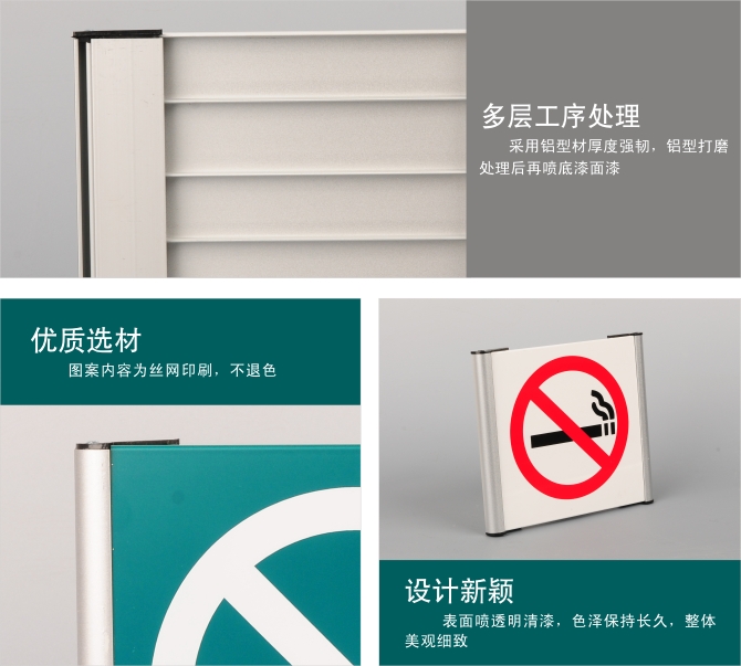 特點:鋁形材表面打磨處理后噴底漆和面漆,絲印內(nèi)容后再在表面上再噴一層透明清漆,作工精細能夠保護絲印的內(nèi)容不受磨損?剖遗朴址制矫婧突∶妗
