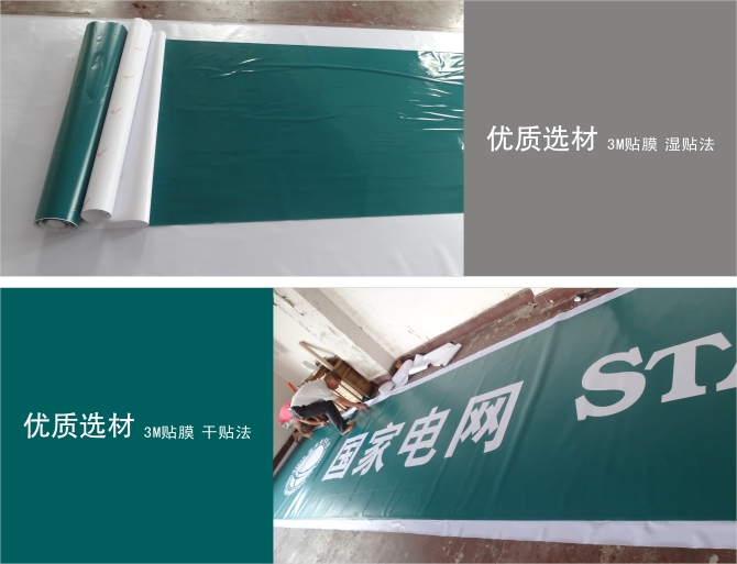 材質(zhì)工藝: 先用白色膜雕刻成形,再通過干貼或濕貼方法貼到國網(wǎng)綠進口3M膜上